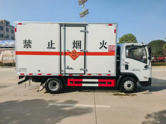 潍柴蓝擎爆破器材运输车底盘配置:厢体长宽高:4200X2100X2000(MM),核载吨位:950(KG),用冷轧钢板,内部采用铝板,夹层复合阻燃材料,严格控制防火阻燃性,车厢内以及边部安装的有烟雾报警器以及固定装置,厢体贴‘爆破器材’危险品标识。