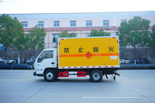 江铃爆破器材运输车底盘配置:厢体长宽高:3680X2100X2000(MM),核载吨位:1300(KG),用冷轧钢板,内部采用铝板,夹层复合阻燃材料,严格控制防火阻燃性,车厢内以及边部安装的有烟雾报警器以及固定装置,厢体贴‘爆破器材’危险品标识。