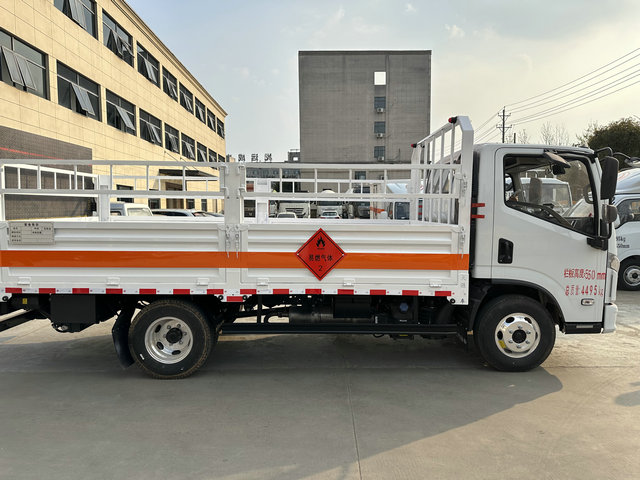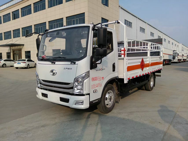 上汽跃进气瓶运输车底盘配置:栏板长宽高:4200X2100X600(MM),车辆外部采用专用冷轧钢板,内部采用铝板,夹层复合阻燃材料,严格控制防火阻燃性,车厢内以及边部安装的有烟雾报警器以及固定装置,厢体贴‘易燃气体’危险品标识。